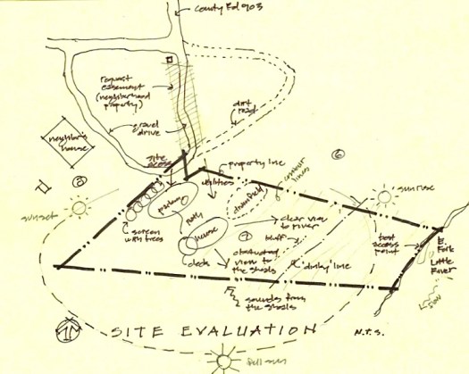 Logistically, the house needed to parallel the contours to minimize sitework. The contours suggested that the facade facing the river be oriented Southeast. Knowing that the best passive solar orientation would be South, I twisted it a bit to get it closer to South, while still straddling the contours. Easy access to the jobsite area, and later parking, was available on the north side. Utilities were also located on the north side, except that city sewer was not available. The logical place for a septic tank and drainfield was on the low-slope east portion of the site.