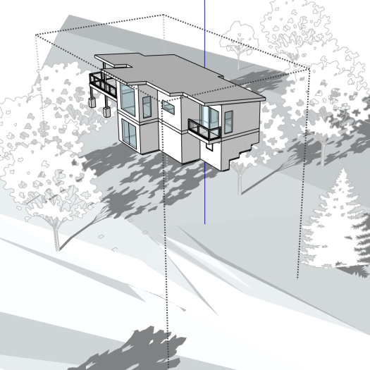 In this post we’ll delve into how it works. Design development is the second of the five phases of service that architects typically provide. Using the dinky House as a case study, we’ll explore the architect’s process, or at least my process. In this phase we advance the plans, more precisely place the house on the site, select the primary building materials, and decide on the major building systems. My toolbox containing paper and pens is supplemented during this phase, and computer modeling is added.