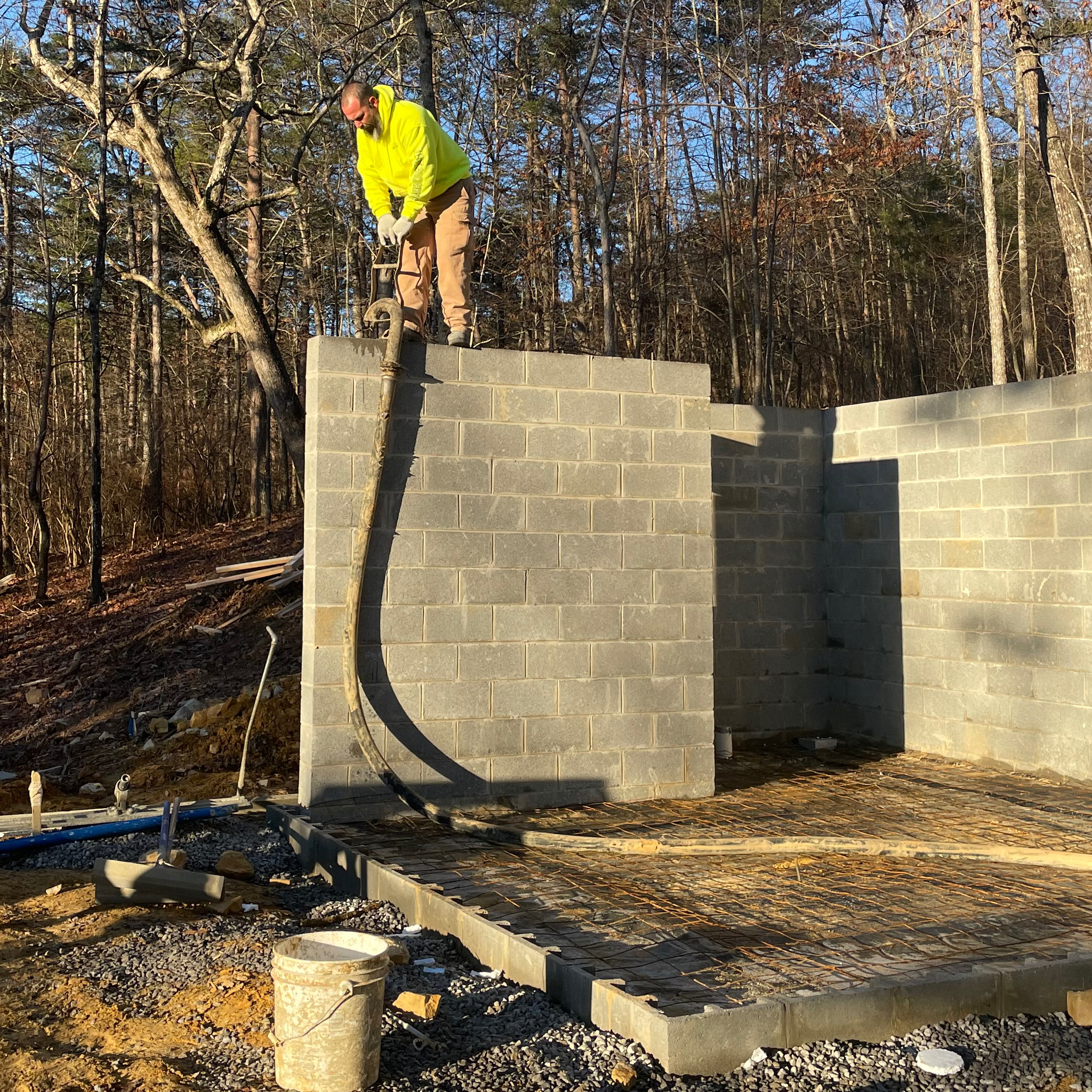 In North Alabama, the late fall and winter months tend to be our wettest of the year. 2020 was not an exception and for several weeks Nature toyed with us. To pour our footings, not only did the skies have to be clear, but the gravel road leading to the jobsite had to be dry enough so that a really heavy cement truck did not get stuck in a rut. When we got a marginal break in the weather, Phil ordered half-full trucks so that they could get to and fro. Clever.
