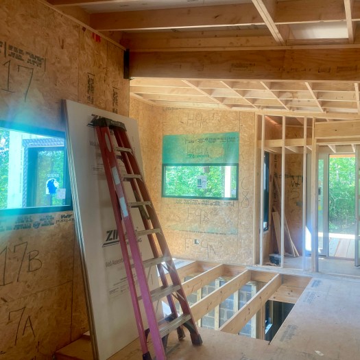 To get in the dry, there was still some interior framing to address, all the windows to install, and a roof to cap it off. Most of this landed on Phil’s key guy, Richard. I’m not sure what job description to assign to Richard. On my project he was a framer. window installer, siding installer, roofer, drywall hanger, finish carpenter, and cabinet maker. In a day and age where it’s hard to find anyone without tunnel vision for their own particular task, it is refreshing to see someone who can do it all, and do it all well. To get in the dry as quickly as possible, the bearing walls were erected first, so that the roof could be installed as soon as possible. Of course, the remaining interior walls needed to be installed as well to clear the way for the rough-in work. Everything builds on something else. There were plenty of dry-in tasks to keep Richard and his sidekick, Hunter busy through the month of April and well into May. By the end of May, we were finally dried in. The sun shone through the forms, making spaces!