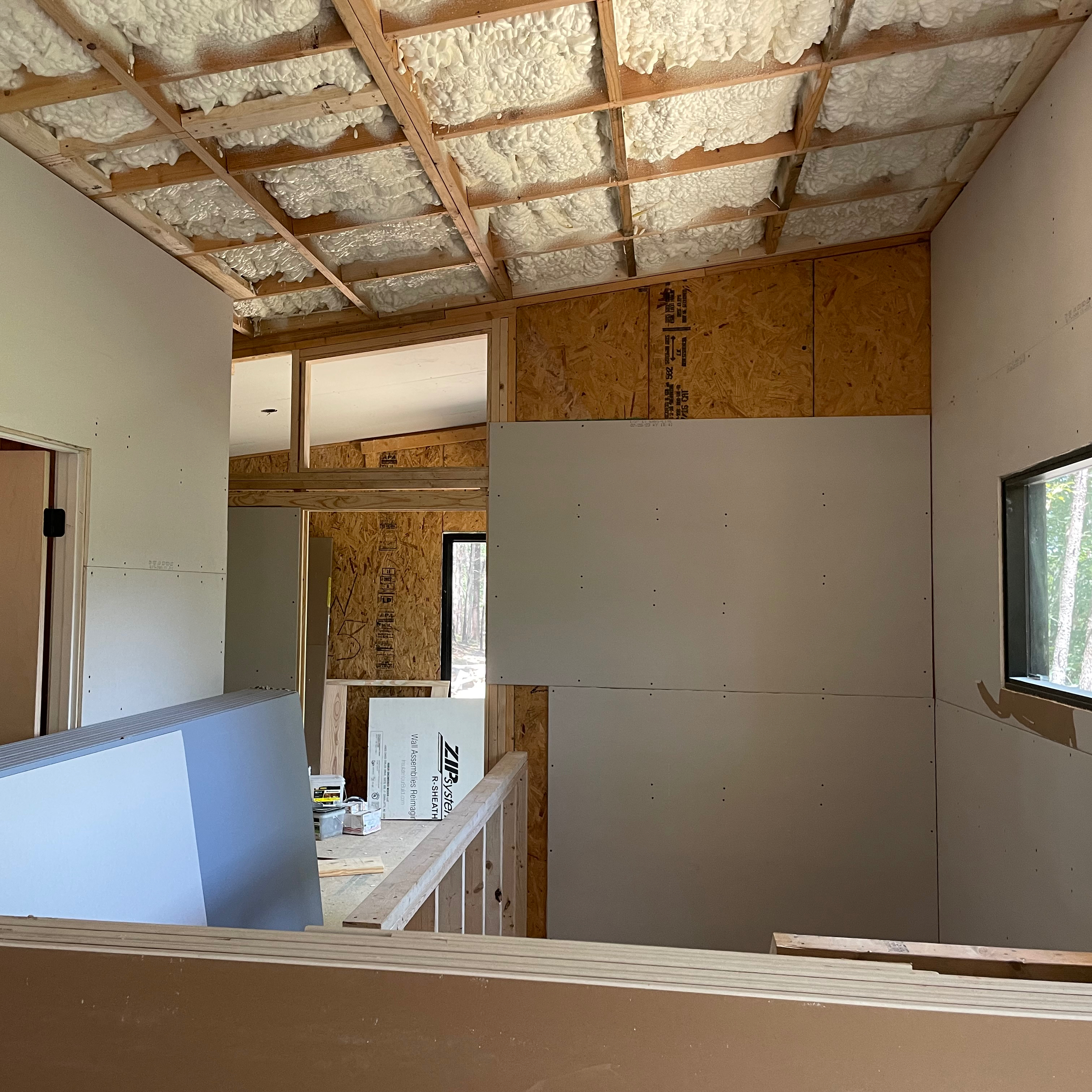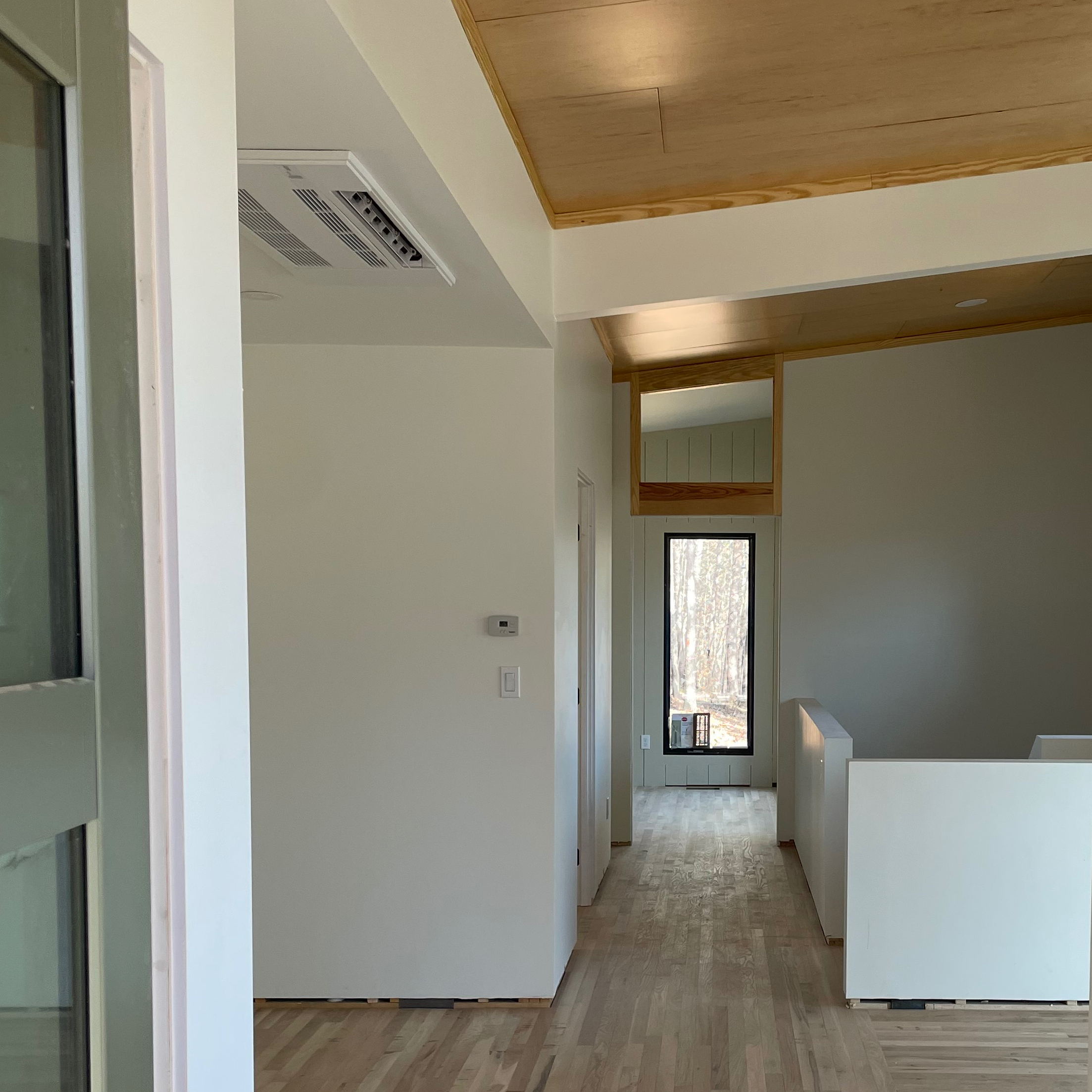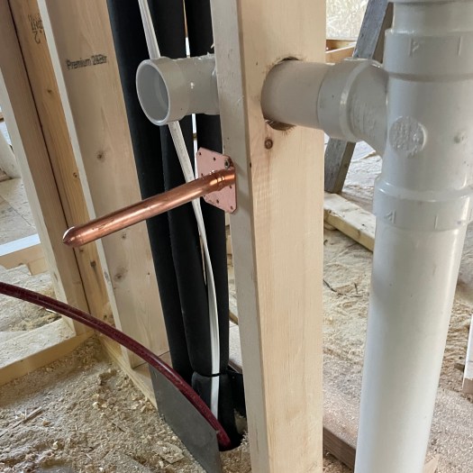 The HVAC sub was the first to arrive in early June 2024. Most of the houses in our region of the country utilize forced air systems, but mini-splits are becoming more common. With no attics to run ducts, its whisper quiet operation, and its uber efficiency, mini-splits made perfect sense for the dinky. The use of SIPs meant that I could heat and cool the whole house with just a couple of tons. The rough in was pretty straightforward. They set the outdoor units (condensers) and ran the line sets to where the indoor units (air handlers) would eventually be. The plan called for one unit in the basement, a slightly larger one in the dining area, and one in each of the bedrooms. In a really tight house it is really important to vent it well. With an ERV bringing fresh air in and whisper quiet exhaust fans taking stale air out, we were able to maintain good indoor air quality. One “trivial” thing I want to mention. I walked into the dining area one day and noticed they located the controller smack dab in the middle of the wall, just like they always do. I had them relocate it, to the location along the edge indicated on the drawings, just like I always do.