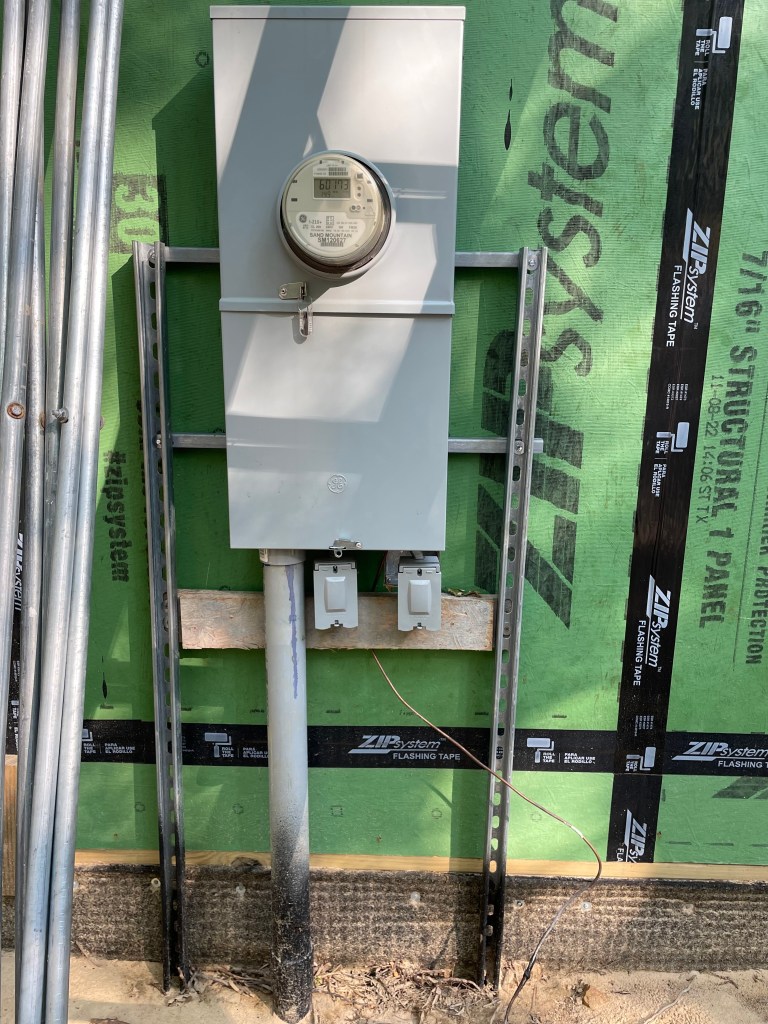 The sitework contractor normally runs all of the utilities from the utility company connection point to within ten feet of the house. The plumber, mechanical contractor, and electrician pick them up from there. The site utilities are normally run early in the construction process and are in place when the rough-in work begins. One common exception occurs when city sewer is not available, such as on a rural site. In such a case, a septic tank and drainfield are required. There are other exceptions of course, such as when the house is “off the grid”. In the case of the dinky, we did not have city sewer but we were on the grid.