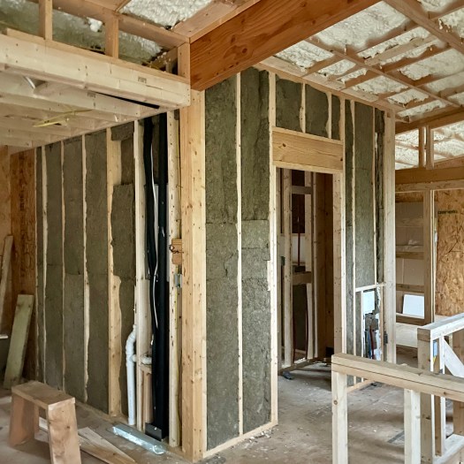 Once the rough in was officially complete, the roof/ceiling assembly was ready to insulate. In this case it was sprayed with open cell foam. This completed the sealing of the building envelope. I then took my iPhone camera and walked room by room through the entire house, taking photographs of every wall, in case I ever need to know where any of the rough-in components are located. (I have already had the need to reference these photos, twice.) Now it was time to call in the ultimate craftsmen to perform a truly precision task. Yes, it was time for Susan and me to stuff mineral wool sound batts into the interior wall cavities. The simple purpose of this task was to make the rooms quieter. We managed to complete this task in a weekend….or maybe two. With everything in the walls and ceilings, it was time to cover it up. Next on the list was hanging drywall and installing paneling; but, that and more is a story for next time, when we explore Tunnels & Lights.”.