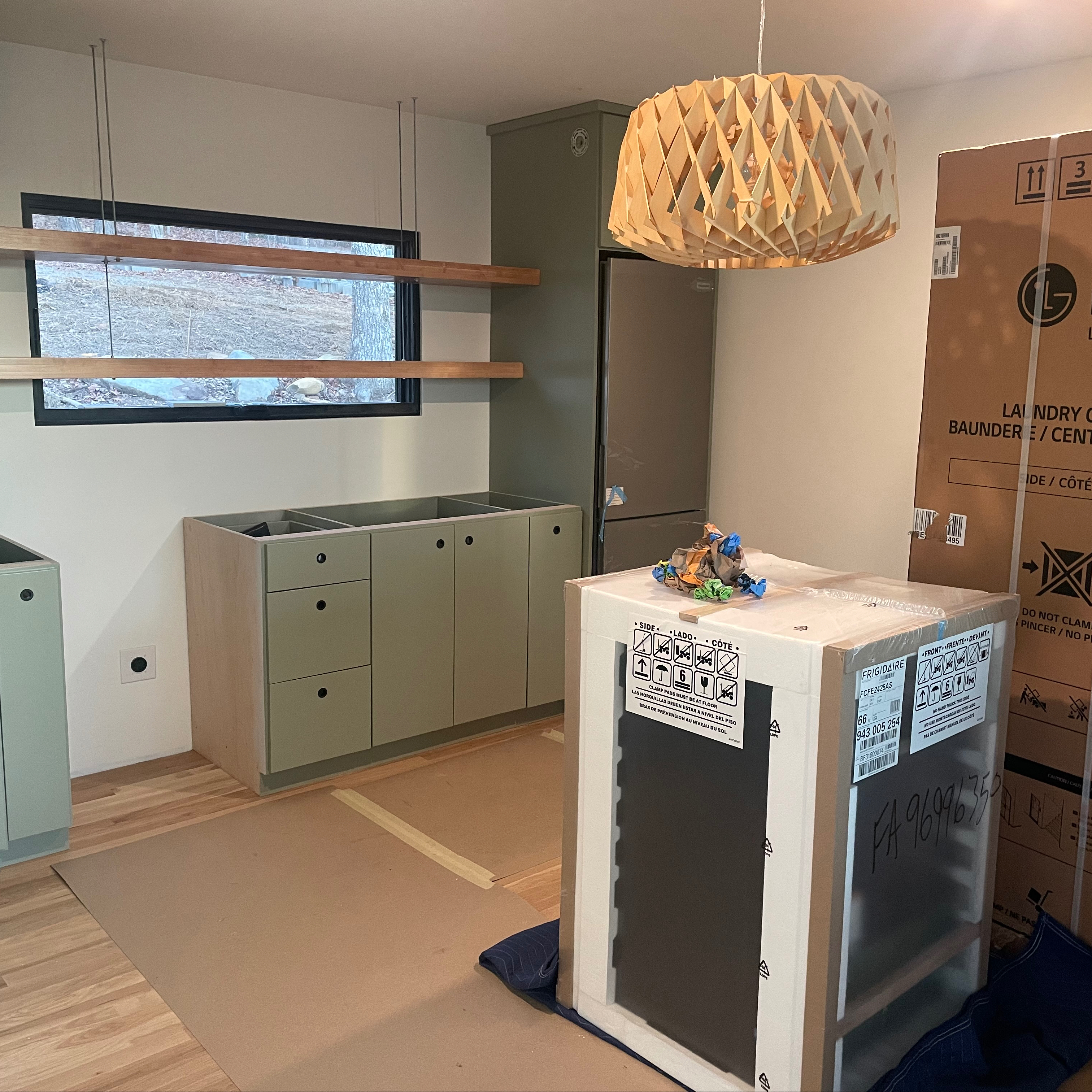 November brought both periods of rain and periods of sunshine. Susan and I continued to spend our weekends laboring in the increasingly brisk outdoors. We built gabion planter retaining walls, had our guy install them along the uphill portion of the house, where Susan and I filled them with rocks and plant material. We also planted numerous trees and shrubs to ground the house and provide some erosion control. The rains revealed where the drainage issues were. Enter shovel, wheel barrow, rock, piping, and a sore back! Inside the dinky, Richard was ready for the cabinets and probably beyond ready to free up his shop space. He carefully installed the cabinets over the newly finished wood floors. We were really happy with the painted green look. I was especially happy with the drilled and grommeted “pulls” and the chunky floating shelves. The cabinets arrived along with Thanksgiving! I always caution my clients that very little construction takes place between Thanksgiving and New Years. I hoped the dinky might be an exception, but alas….it was not to be. The electrician did manage to install the light fixtures and the tile setter completed the shower and tub.