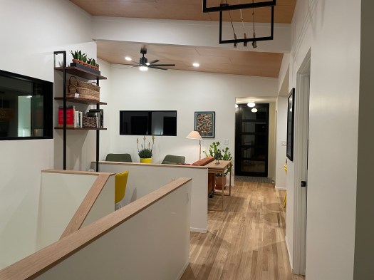 I’ve always loved classic strip oak floors, sanded and finished in place. Before installing this type of flooring, it is important that the HVAC is operating, so the boards can climatize. The mechanical contractor had little to do in the finish phase other than to physically install and connect the mini-split units. All this was done shortly after the painting. Once the flooring arrived, the dinky was in the middle of the acceptable temperature and humidity range. In addition to the flooring, the parapet wall caps surrounding the stair, the stair treads, and even the handrails were all fabricated from white oak. The finish we decided on was a product I had never used before. It was a penetrating finish, only slightly shinier than the raw floor, and lacked the slick feel of polyurethane. I think the matte finish looked great and I like it even more as time passes. The light filters in without the mirror effect of high gloss urethane. And with the completion of the wood floors, went the remainder of October.